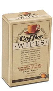 Razgrađuje i uklanja mrlje od kave i ostale tvrdoglave mrlje od hrane i pića.Značajke:Coffee Wipes čini snažna organska otopina enzima u prikladnoj mokroj krpici. Za uklanjanje otpornih mrlja, temeljito prebrišite područje mrlje i ostavite da se osuši. Coffee Wipes su u potpunosti prirodan i netoksičan proizvod. Također izvrstan za čišćenje aparata za kavu i posuda za kuhanje kave. Uvijek imajte jednu uz sebe ili u autu. *Upozorenje: Ne miješati s drugim kemikalijama. U slučaju kontakta s očima odmah isprati oči hladnom vodom. |